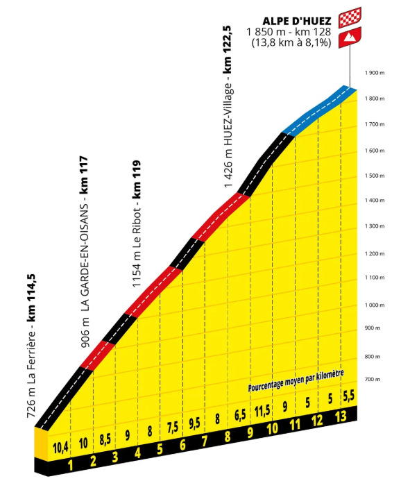 – Alpe d’Huez (Isère 38 – commune d’Huez – ~1 400 hab.) : ville étape pour la 33ᵉ fois
